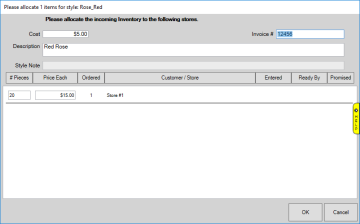 - At the top enter the Cost (each), Invoice, and Description. Then in the main window enter the # Pieces and Price Each.