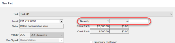 When this item is added as a part to a repair or assembly job it will display a field to specify weight and will show a quantity of 1 that cannot be changed. This is because each part represents one quantity. If you want to add additional quantity you need to add additional parts. Enter the measure to be used. Upon finishing this task the quantity will be reduced by one and the measure reduced by whatever was entered. These amounts are taken from the oldest shipment on file.