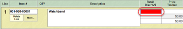 When this item is added at POS the sale line will display and automatically highlight the retail field in red. Enter the retail price for the item being sold. You cannot specify quantity because each sale line is one item. If there are multiple you must add additional sale lines. Upon completing the sale the quantity will be reduced by one and The Edge will calculate the cost of the sold piece based on the mark up specified on the shipment. This amount is taken from the oldest shipment on file.
