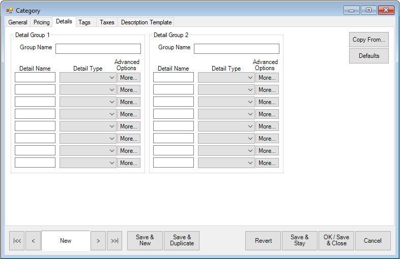 You can use the Copy From… option on any tab to import information from that tab of another category. You can also use the Defaults option to load default category information.