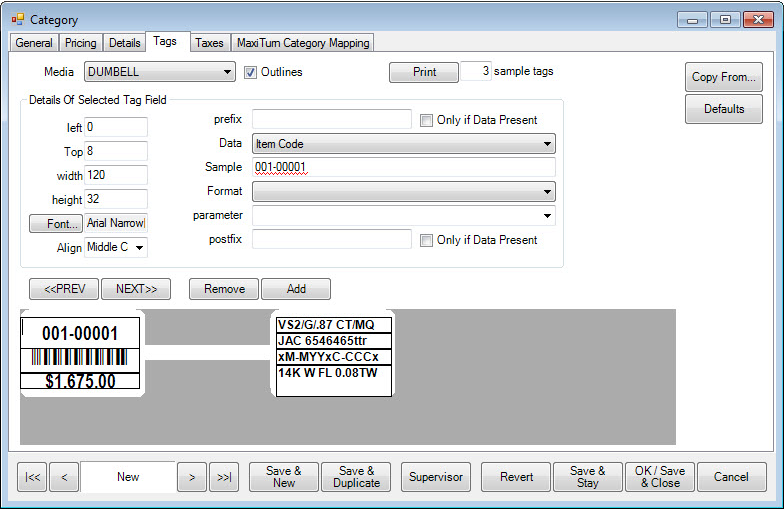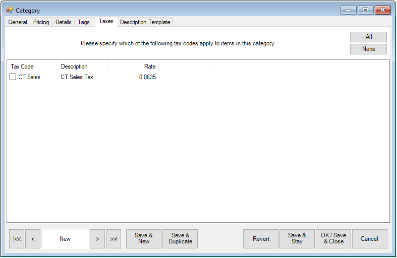 - This tab is used in the event a category has taxes that are different from those of other items, such as one that is classified as a luxury item. These taxes can be selected from those shown here, which are defined in the Administrative menu.