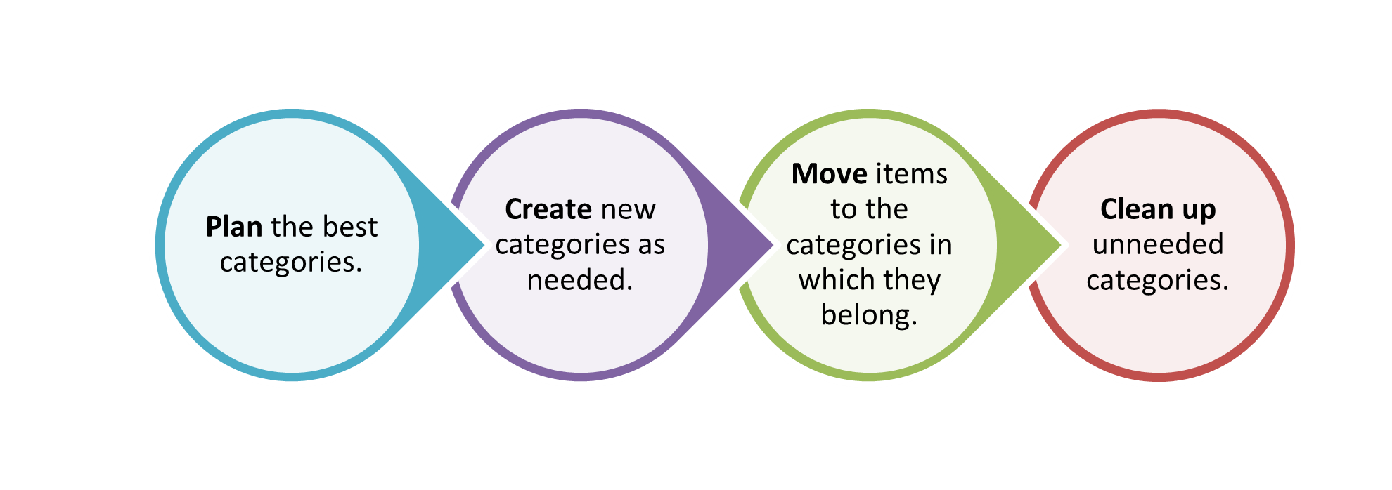 For example, you may find that you have categories that are nearly the same, just labeled differently. Or you may find that your categories have gotten too specific; for example, categories should not go to the vendor level.