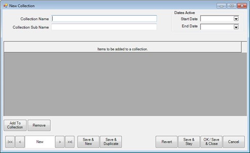 - From the Inventory menu, select Items > Collections > Add. The New Collection screen will appear.