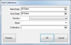 - From the Inventory menu, select Items > Collections > Find. The Find Collections filter will appear. As always, the Presets feature allows you to save search parameters for future use. See the section entitled Presets for more information.
