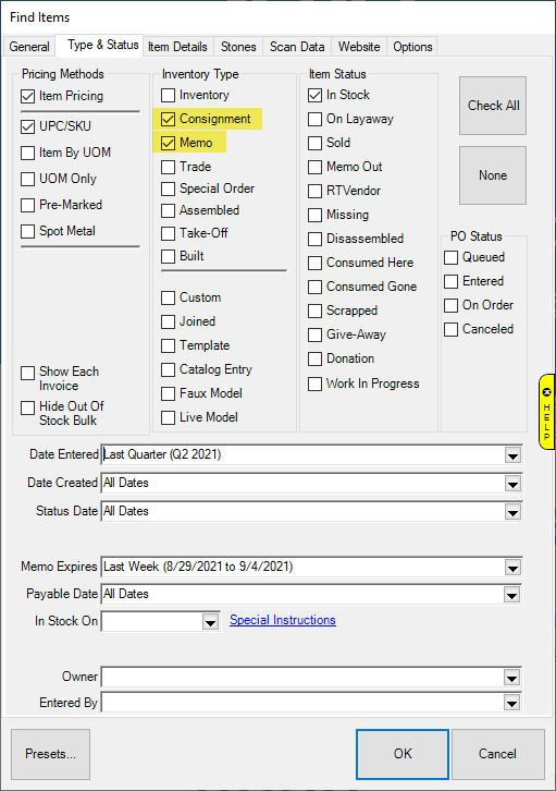 To work with Consignment and Memo items, for example, to determine what payments are due, use the Item Find feature. In the Type & Status tab, under Inventory Type, deselect Inventory and select Memo or Consignment. You can also specify the dates or a specific owner or vendor.