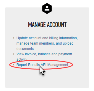 - On the left, find the Manage Account section and click the Report Results API Management link.