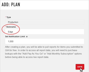 - In the Add: Plan window enter Edge as the Nickname and, optionally, enter a number into the Set Notification Limit field. When this number of lookups is reached you will be emailed. Click the Save button when done.