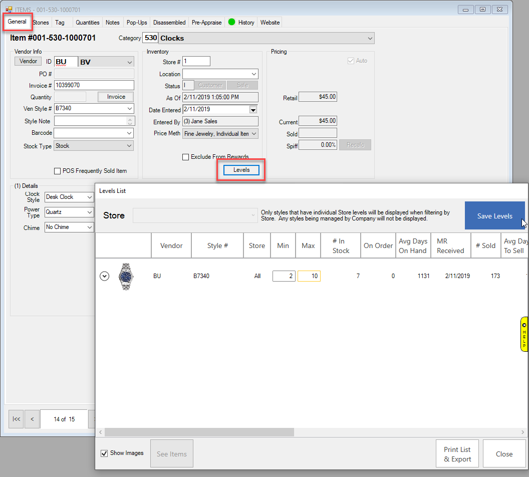 The Levels function allows you to view your inventory on a vendor and style basis. This works in concert with the Rapid Reorder form, and in turn, the Purchase Order feature, to help you maintain optimum inventory levels. It is also a useful tool for monitoring stock quantities and also offers a fast way to gauge a particular style’s performance by displaying some of the more pertinent statistics. Additionally, it allows you to set minimum and maximum stock levels per style to ensure they are never out of stock.