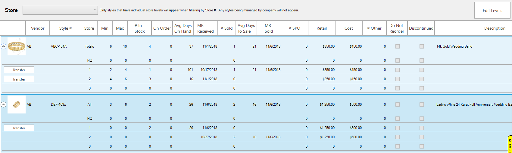 Multi-store only; displays break down by store for each style. The first row of each style will show Totals if managing per store or All if managing by company.