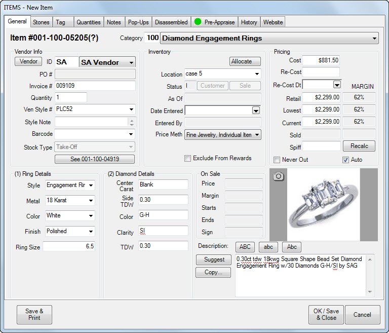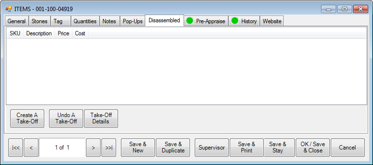 A take-off is a new component that you are taking away from the original item. You should create a new take-off for each part that the item is getting broken down into. For example, if you were disassembling a ring with a single diamond mounted, you would create two take-offs: one for the diamond and one for the ring mount. You can create as many take-offs as necessary to completely account for the disassembly of an item. The full details of the original piece you are disassembling will be automatically copied into this New Item window.