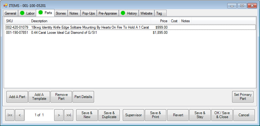 Use the Remove Part button to individually remove each part from this item. For stock parts, they will be restored to in stock status in inventory under their original stock number. Miscellaneous parts will be removed without affecting any inventory since they never existed in inventory in the first place. You can add them as new items (with a backdated entry date) if you wish.