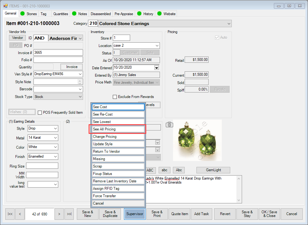 Found in Supervisor at the bottom of the Item window, the See Cost, See Re-Cost, See Lowest, and See All Pricing options causes these fields to become visible in the Item window. They can be turned off using the analogous Hide Cost, Hide Re-Cost, Hide Lowest, and Hide All Pricing.