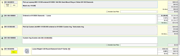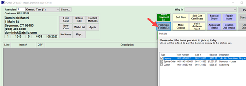- Click Pick Up / Finish and select any Special Orders, Custom Jobs, and/or Layaways that will be part of this join.