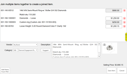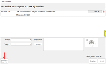 - The Create a Joined Item window will appear. The item you initiated the Join from will be preloaded. Use the Add Items From POS button to select one or more items to join together.