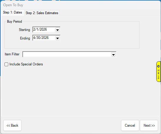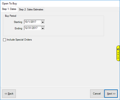 Open to Buy requires several steps for inputting data required. Begin by selecting Inventory > Buying Tools > Open to Buy. After completing the fields in each step, select Next.