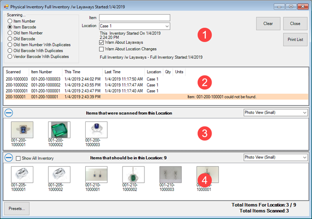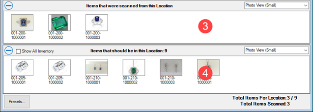 The bottom two sections show items that were inventoried as well as those items that are still outstanding. By default, the outstanding items for the selected location will be shown. To see all items, check the Show All Inventory box. This may negatively affect performance based on the number of items in the inventory.