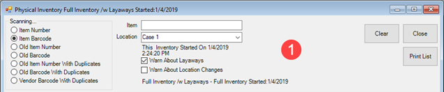 Upon creating a new inventory, The Edge will automatically open the Scanning window. This is used to inventory your items. You can manually get to this screen using Inventory > Physical Inv > Continue Inv.