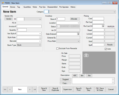 - Select Inventory > Item > Add. The New Item window will appear with the General tab open.