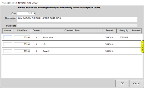 If the item is in response to a purchase order, associated with a special order, it is a bulk item, or if you have a multistore environment, the Allocate window will appear. This tells The Edge what to do with the item: assign to a particular store, increase bulk quantities, assign it to a special order, etc.