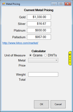 - Each metal will be listed with the last entered price. To update a price, simply enter the new price next to the type of metal and click OK.