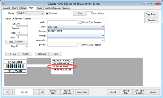 By default, The Edge prints the date entered and cost of each item on printed jewelry tags. This date and cost is disguised by random characters and positioned with dashes so that you can read the date and cost of an item if you know the formula.