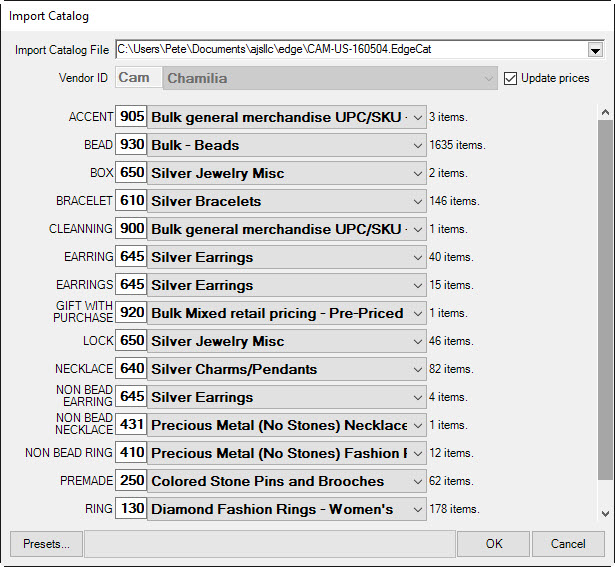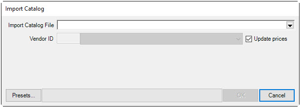 - Check Update Prices if you want the catalog import to update pricing on existing items from this vendor. This will only work if your vendor style numbers exactly match those used by the vendor.