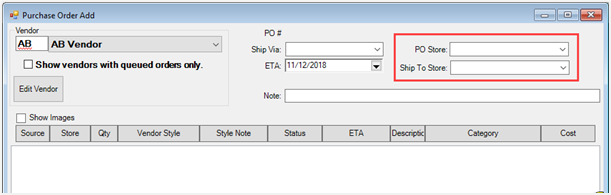 Purchase Orders now include drop-downs allowing you to select the store. On the top right of the PO form you can choose which store the PO is for as well as which store to ship the order to. While available, it is not necessary to specify a store. POs without a store designation will be marked “Unassigned.”