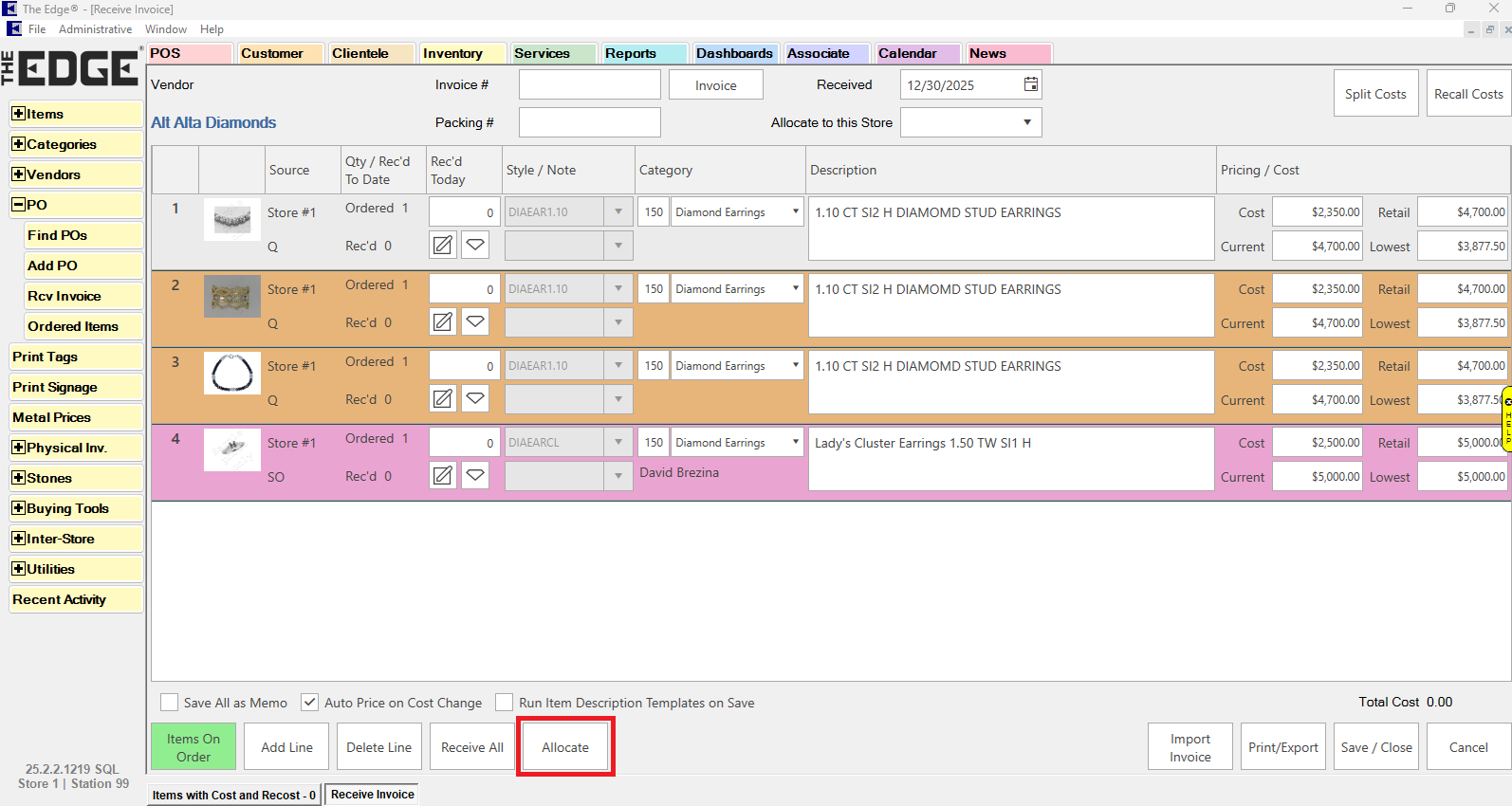 - For each line, specify the quantity received today in the Rec’d Today field. If a store number was previously assigned to this line, it will allocate to that store by default. If no store was specified, the allocate window will appear allowing you to assign quantity to one or more stores.