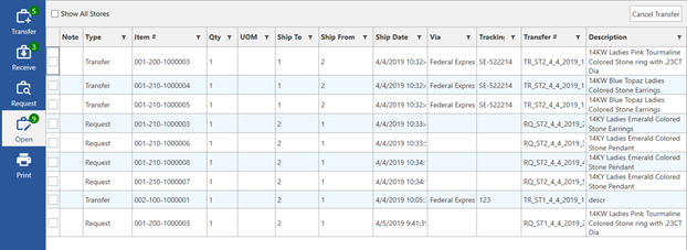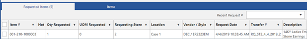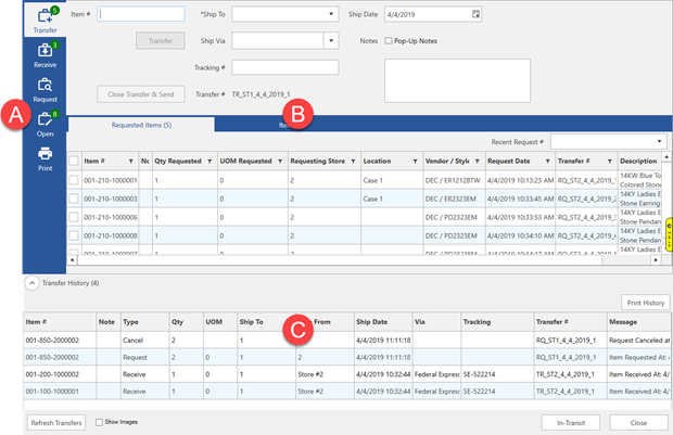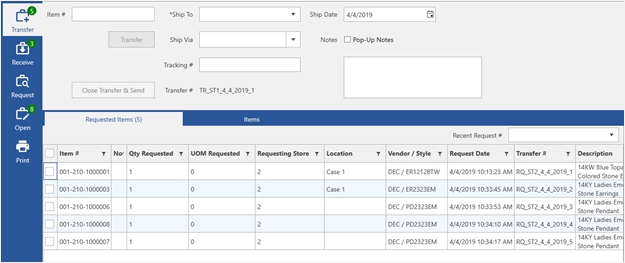 This tab opens a form allowing you to transfer items to other stores. It will also display items requested from your store for easy fulfillment. This form is divided into top and bottom sections.