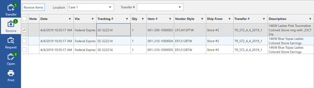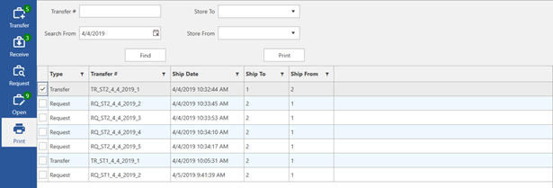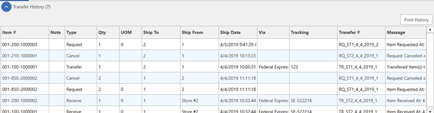 - Print Allows you to print a transfer slip showing all items included on a specific transfer.