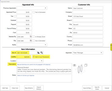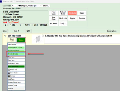 Once you have found or added your Item to the saleline, click More. Click the new Create BriteCo button, which will open the Appraisal Intake screen.
