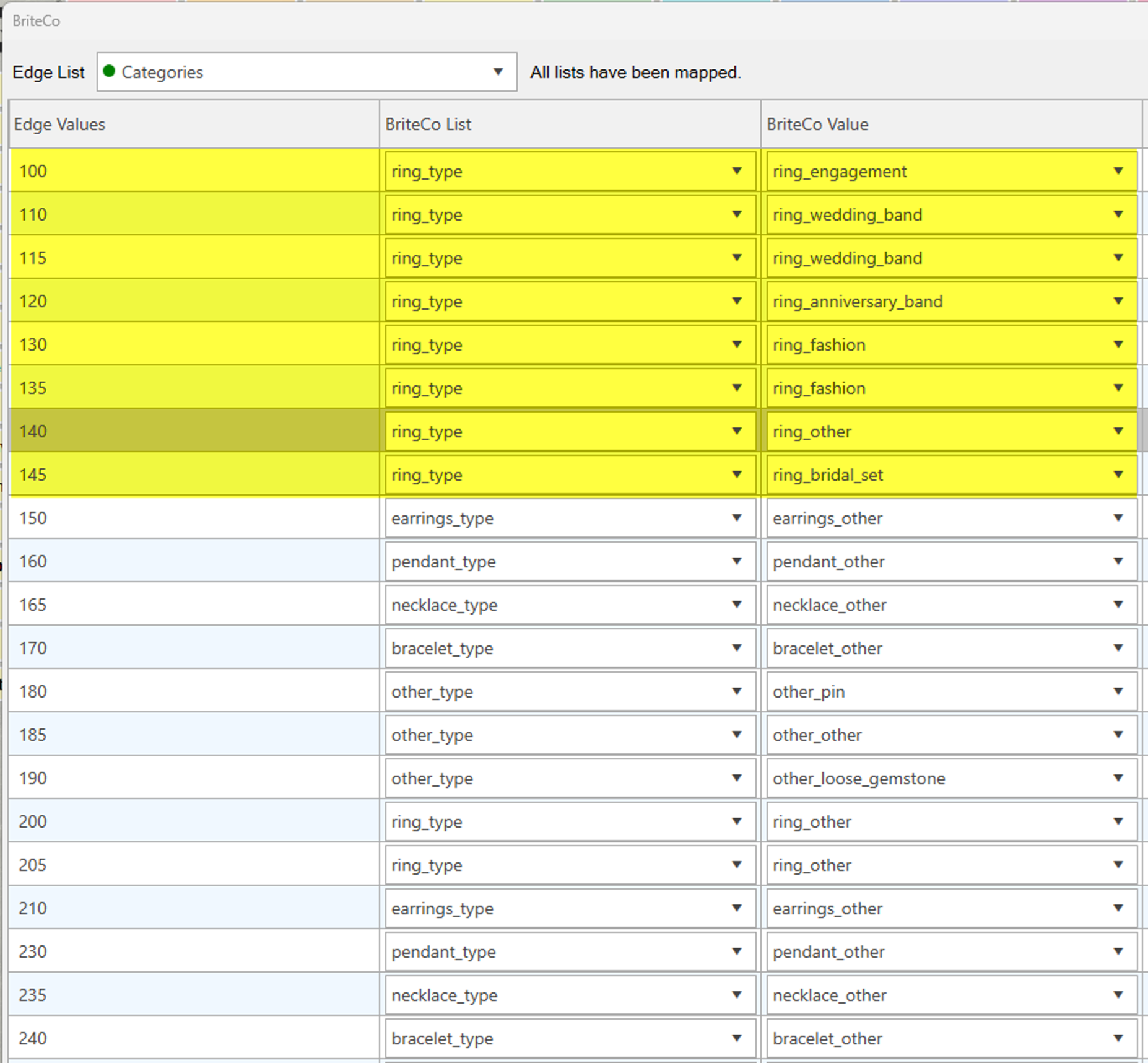 Here you will see Edge 100 Categories and their corresponding BriteCo Value, as well as an example of how other Edge Categories will map to BriteCo.