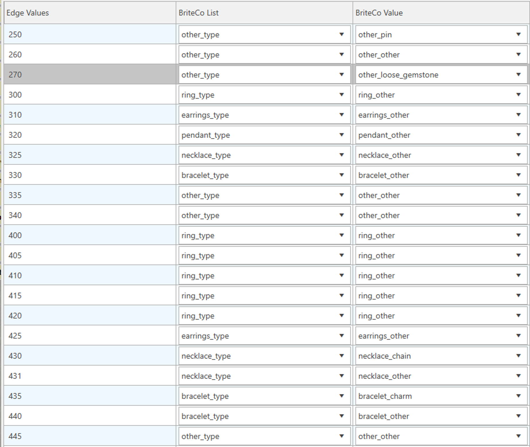 Edge Categories will map to a BriteCo Value as CategoryName_Other (bracelet_other, earrings_other, ring_other, etc). You can choose a BriteCo value that may be more accurate to your custom Category by clicking the dropdown arrow.
