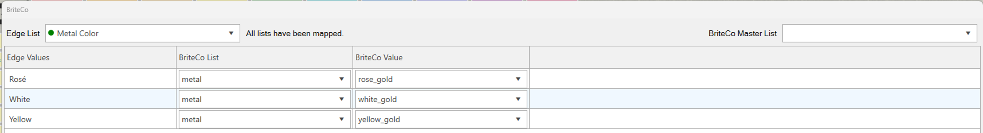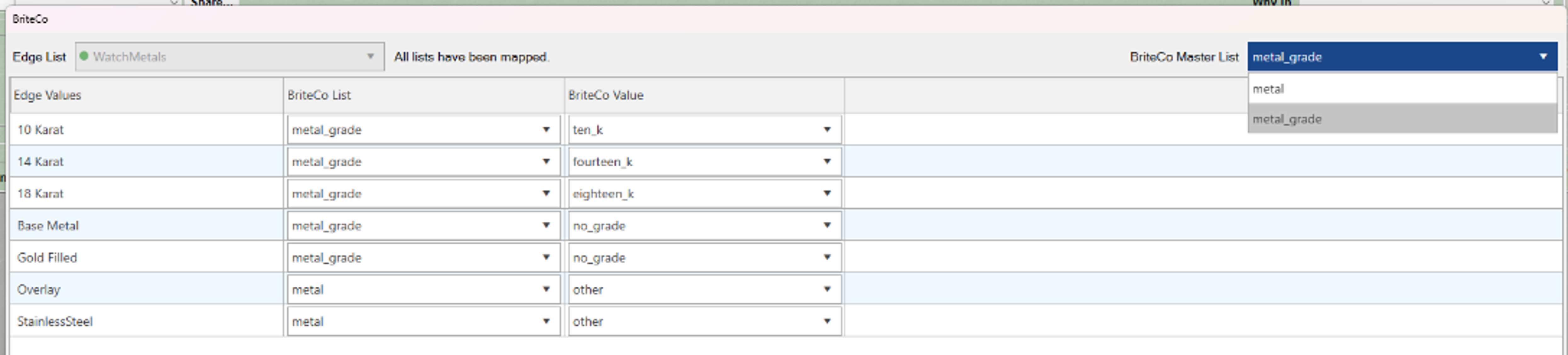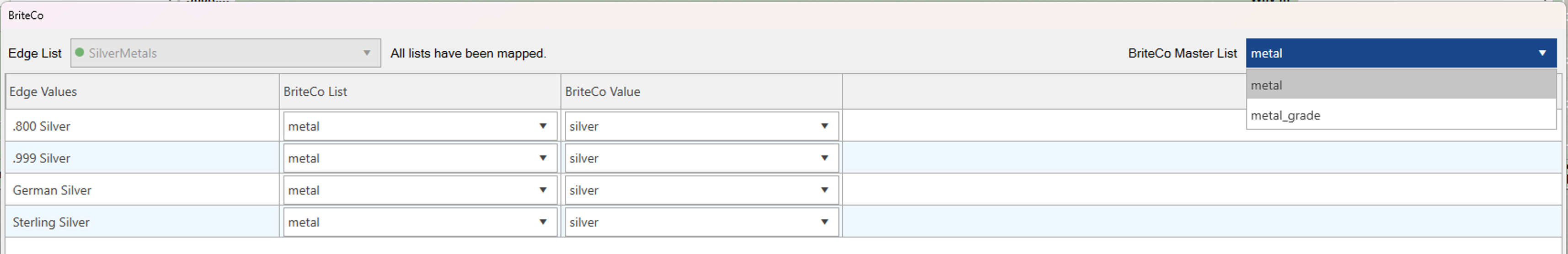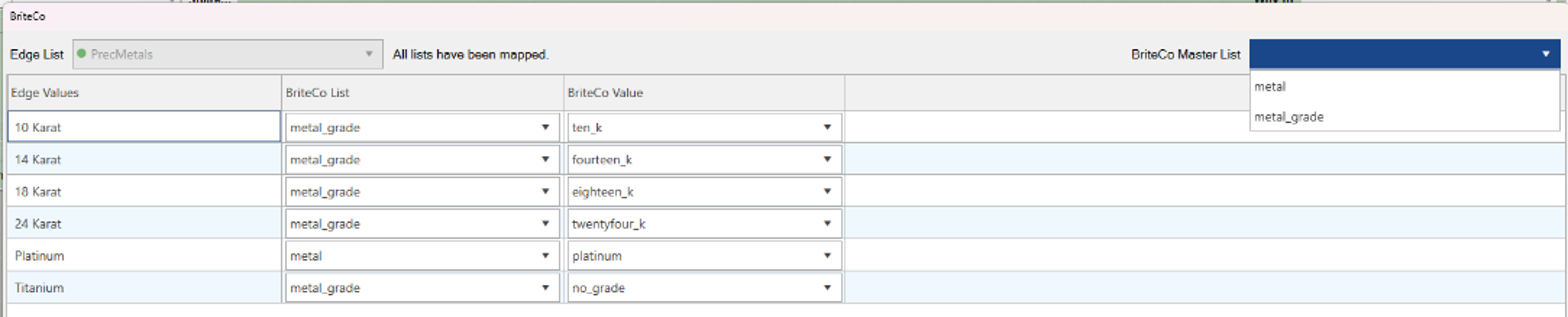 When mapping some Edge Lists, such as PrecMetals (Precious Metals), you may encounter multiple options under the BriteCo Master List dropdown. Under these circumstances, you will want to select the option that best applies to your selected list. Once you have selected the BriteCo Master List, you can then manually select the best corresponding options from the BriteCo List and BriteCo Value dropdowns.