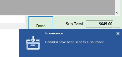 Click OK to send the purchase to Luxsurance then Done to complete the sale:
