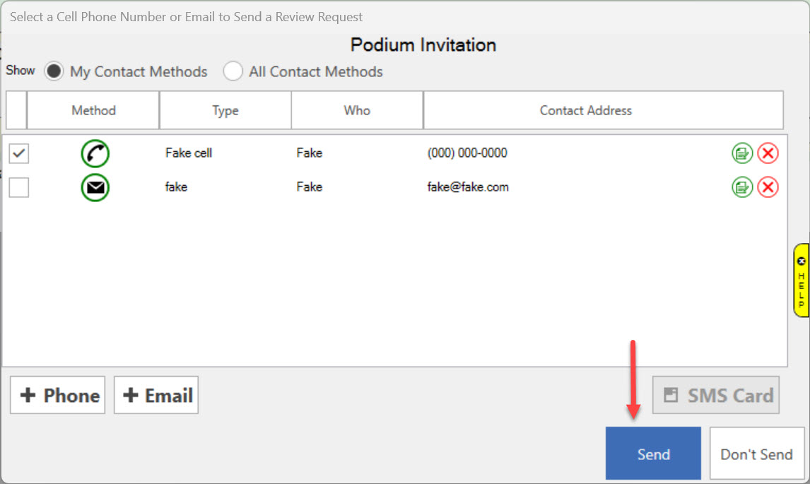 The Podium Invitation screen will appear asking you to choose where to send the invoice. Choose either a cell phone or email and click Send: