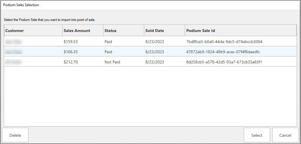 This will bring up Podium Sales Selection window with a list of both Paid and Not Paid invoices. Highlight the Paid invoice you’d like to process through POS and click Select.