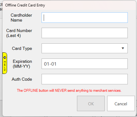 - Enter the credit card information into the fields on Offline Credit Card Entry screen then click OK.
