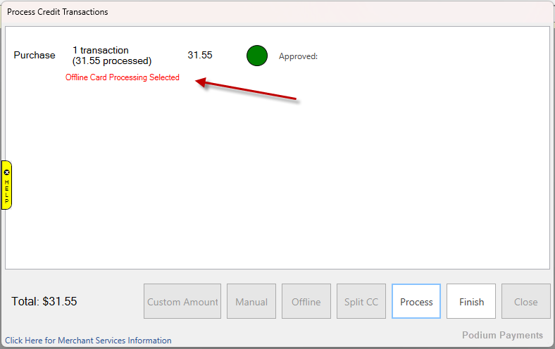 - The Process Credit Transactions screen will now show the Purchase line with a note indicating offline processing was selected, as shown below: