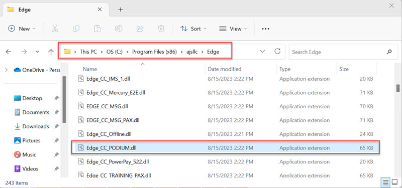 3. The Open File window will open.  Navigate to the folder C:\program files (x86)\ajsllc\Edge and select the file Edge_CC_Podium.dll, then click Open.