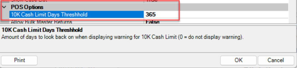 - Scroll down to the POS Options section and locate the 10K Cash Limit Days Threshold option.
