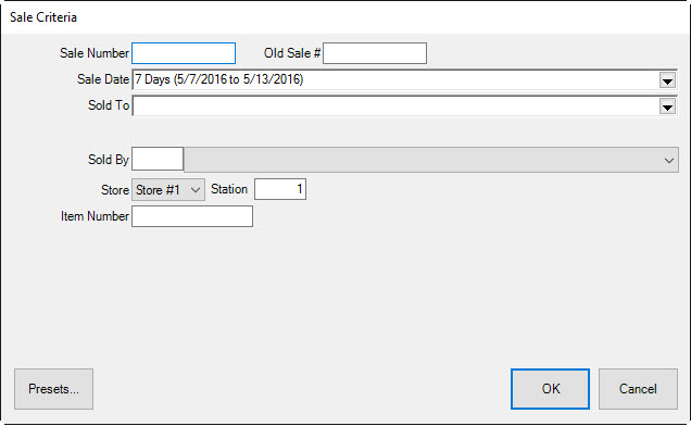 - View a specific transaction by entering a sale number in the Sale Number field or a range of receipts by entering a range in the Sale Date field using the drop-down list. To further narrow search criteria, enter a specific store, station number, and/or associate.