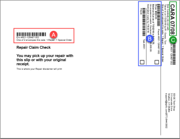 Claim check repair # and barcode; scan this at POS to bring up the customer and transaction