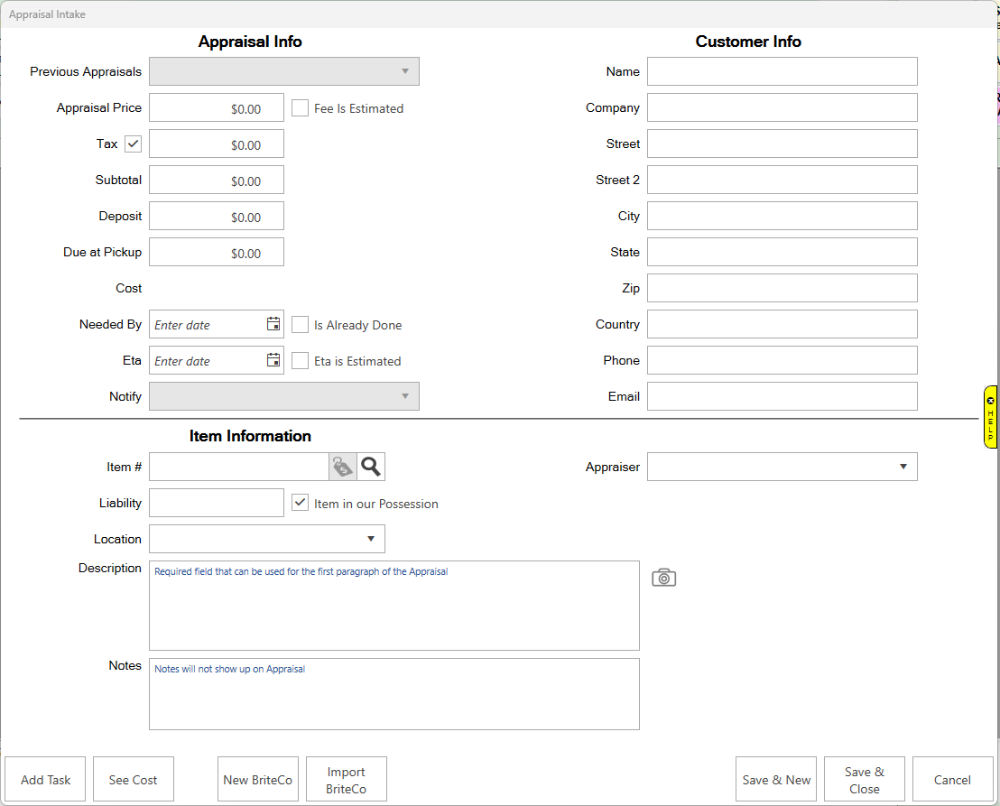 - Enter information about the item being appraised. This is not the actual appraisal (that is completed later in the back office). The only required field is Description.