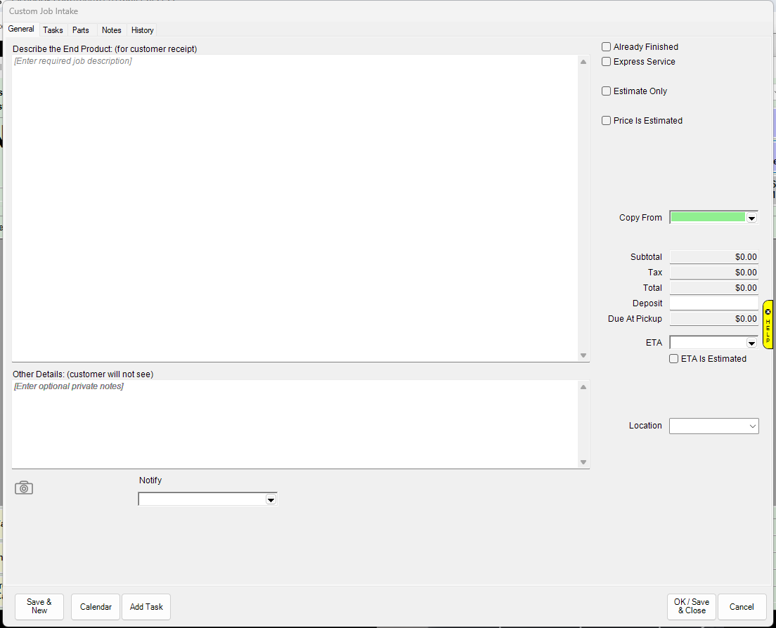 - Open POS and click the Custom Job Intake button. The Custom Job Intake window will appear with the General tab open.