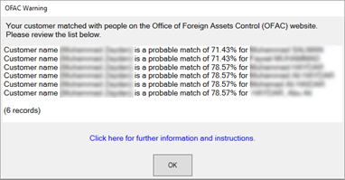 The OFAC Warning window will show potential matches along with the probability that they are a true match. This probability is based on comparing both the name and address.
