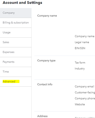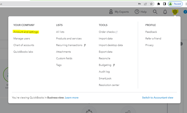- In QuickBooks, click on the Gear icon and choose Account and Settings.