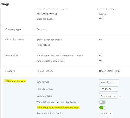 - Under Other preferences there is an option to Warn if duplicate journal number is used. Turn this warning OFF.