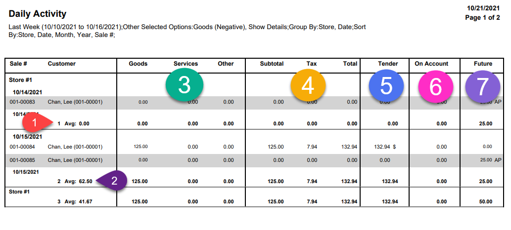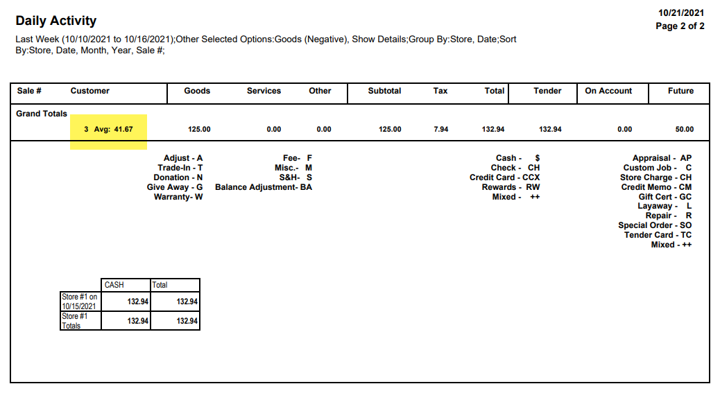 If you want an average in the Grand Totals, as highlighted below, that does NOT include Deposits and Payments, check the box to Exclude Empty Sales on the Daily Activity report filter window when choosing your report criteria.