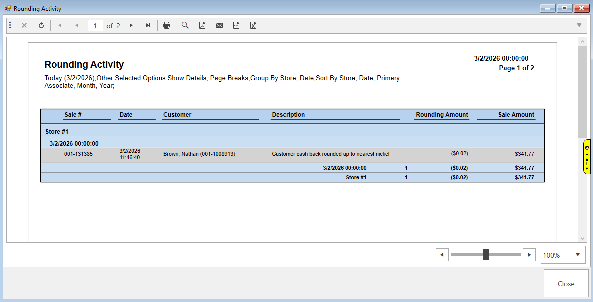 The Rounding report is for reporting on any transactions where the cash amount paid was rounded up to the nearest nickel. This works with the POS Option for Round Cash Transactions to the Nearest Nickel.